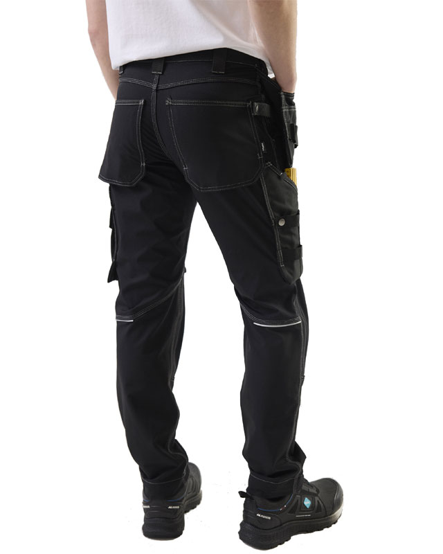 Hängfickorna är utrustade med tre extra fack och verktygshällor. Id-korts ficka. Reglerbar hammarhank. Framflyttad tumstocksficka som är släppt nertill för bättre komfort. Tumstocksfickan är utrustad med två knivhållare, knivhälla och pennficka. Benficka med dragkedja, stor extraficka samt telefonficka. Reflex bak för ökad synbarhet.