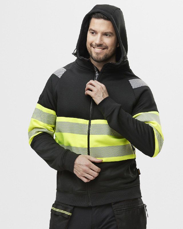 Mjuk huvtröja med hellång dragkedja tillverkad av polyester- och bomullstyg med borstad insida för extra komfort. Tröjan har segmenterat reflextryck, anpassningsbar huva, reflexband över den främre dragkedjan, 2 fickor med dragkedja samt reflexdetaljer. Den har även ribbstickning i hals, ärmslut och nederkant. Reflekterande knappslå. Fickor kan även nås från insidan.