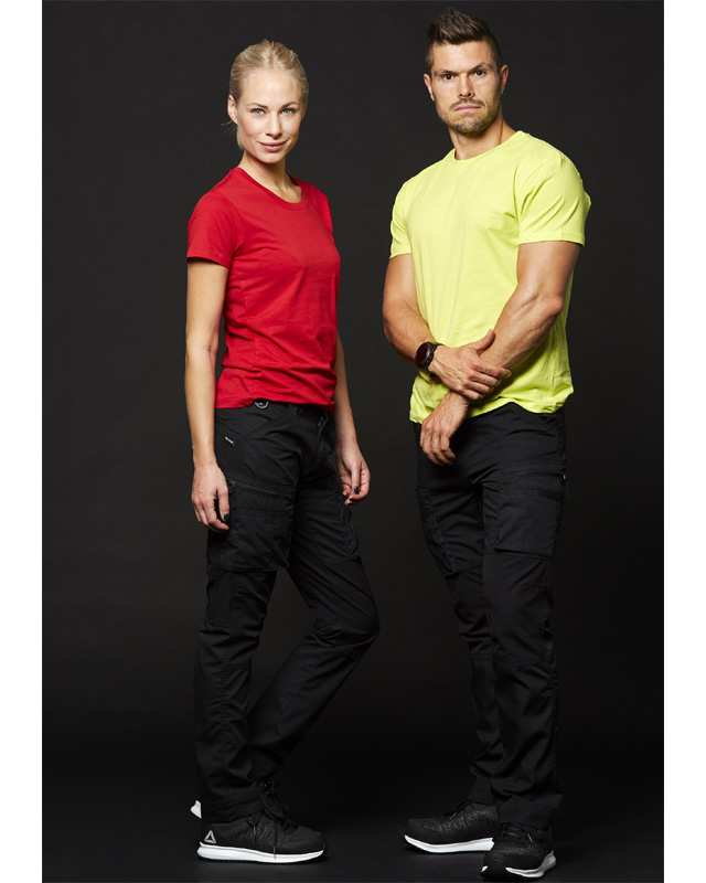 Service byxa med modern passform i stretch med förböjda knän. Två bakfickor. Två framfickor en med extraficka. Två benfickor med bälg och dragkedja med plats för kniv och pennor. Den högra benfickan är utrustad med stor extraficka samt telefonficka. D-ring.
