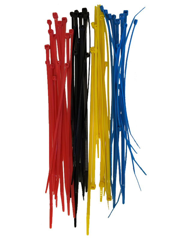 Buntbandssats innehållandes 50 färgade buntband med plasttunga i olika längder och färger enligt nedan.