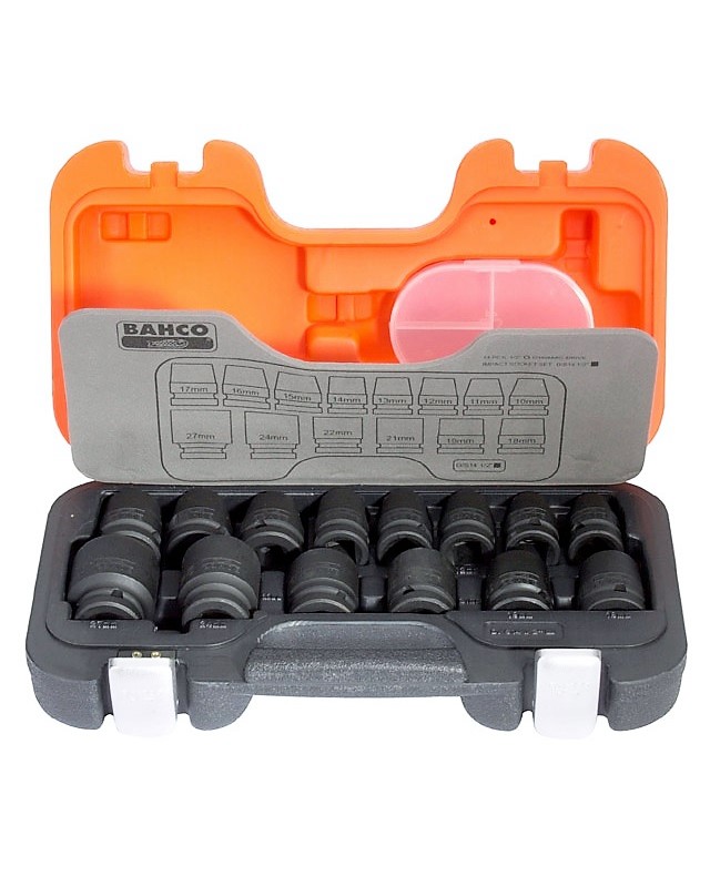 Krafthylssats 1/2" med 14 sexkantshylsor i metriska dimensioner.