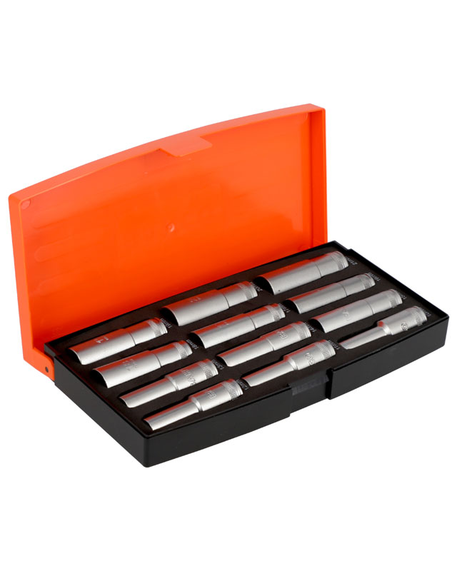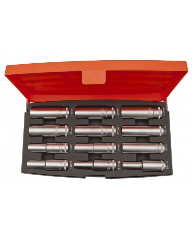 12 st 1/2" långa hylsor 10, 11, 12, 13, 14, 15, 16, 17, 18, 19, 20, 21 mm