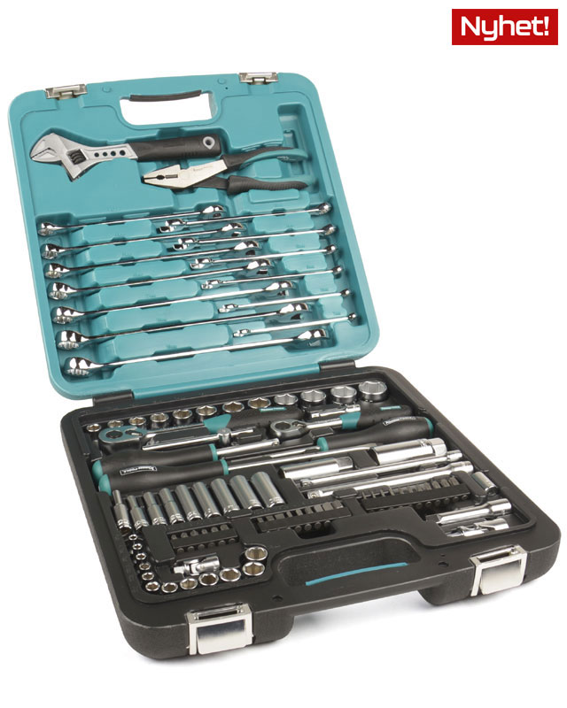 Lådan innehåller 2 st hylsnyckelsatser (1/4" och 3/8") samt en stor bredd av skruvverktyg, extra långa blocknycklar samt tång och skiftnyckel, totalt 89 verktyg.