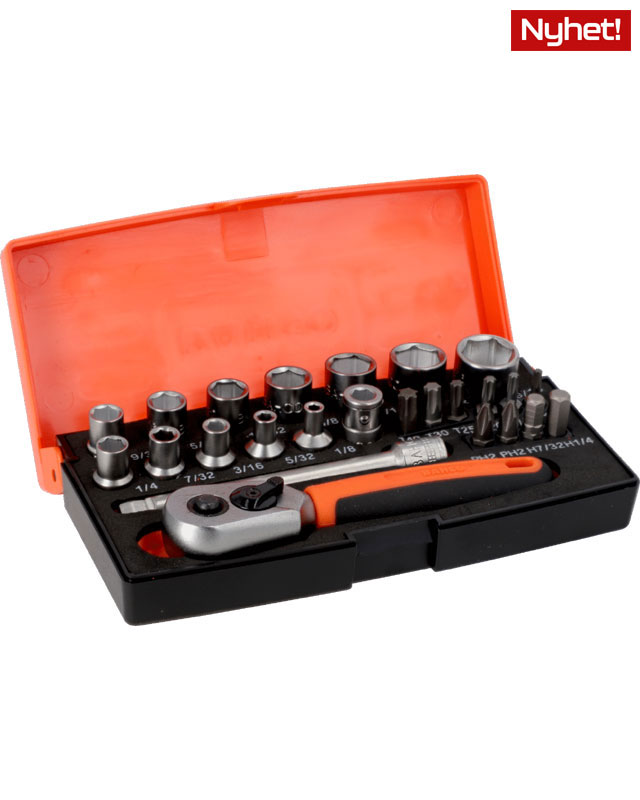 1/4" hylsnyckelsats med fyrkantsfäste och sexkantsprofil med skruvmejselbits/bitshållare, tum-skala